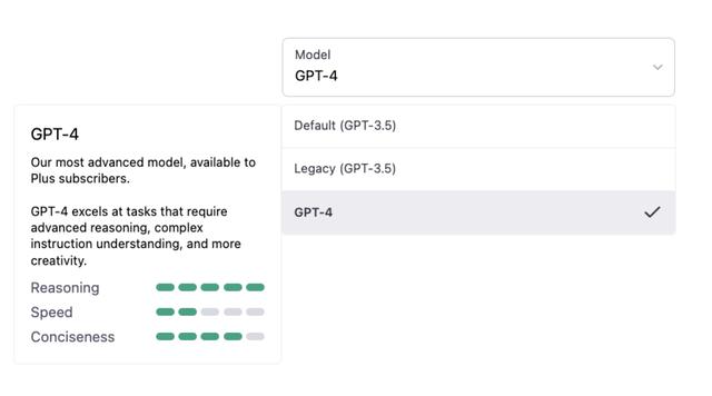 在开始新对话时,下拉框将提供使用旧模型或GPT-4的选项。你需要注意OpenAI的警告,即GPT-4的速度不如其他模型,因为速度差异相当大。
